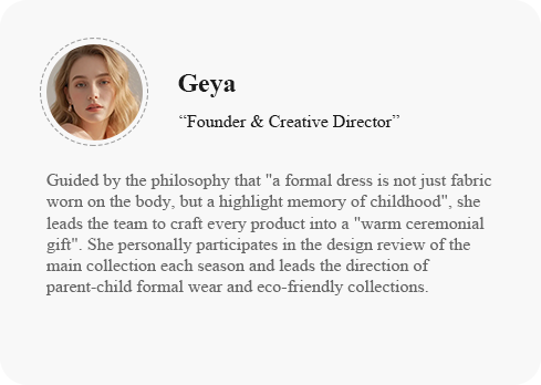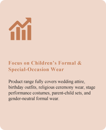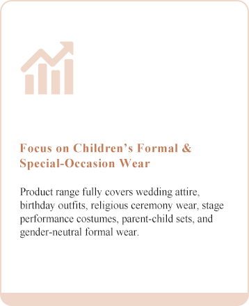 Our product portfolio spans a wide range of categories, including flower girl dresses for weddings, birthday party outfits, attire for religious ceremonies, stage performance costumes, parent-child matching sets, as well as gender-neutral minimalist formal wear. Great attention is placed on delicate design details, fabric safety, and wearing comfort. Whether it is a lavish princess-style gown or a meticulously crafted miniature suit, our goal is always the same: to ensure that every child wears a one-of-a-kind outfit on the most special day of their life.