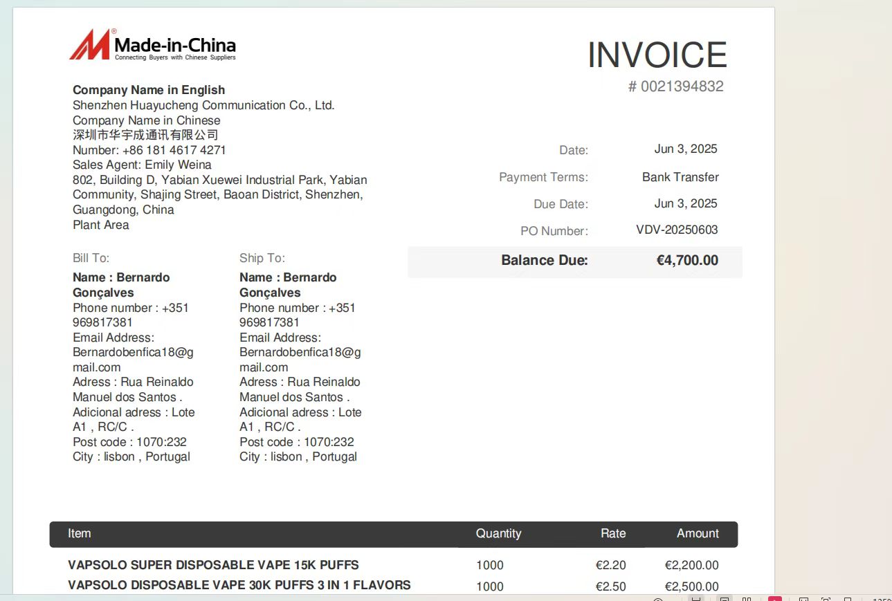 A French client was aggressively price-shopping for Vapsolo and JNR products. After days of comparing, he found Seller B, whose quote was less than half the others. Overjoyed, he rushed to pay several thousand euros. Seller B even provided a professional invoice, using a famous B2B platform’s branding and real company info to make it look legit. But once the money was sent, Seller B disappeared without a trace.